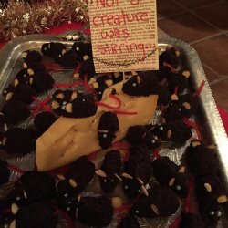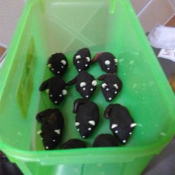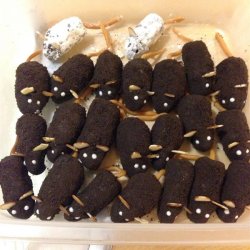 3Roll dough in confectioners sugar (for white mice), and in chocolate cookie crumbs (for dark mice). On each mouse, place dragees in appropriate spot for eyes, almond slices for ears, and a licorice string for the tail.
