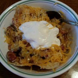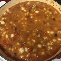 2Add canned tomatoes, kidney beans, hominy, taco seasoning and ranch salad dressing mix. Mix well and let simmer over low heat for two hours. (Add 1 to 2 cups of water if necessary to make soup the desired consistency)