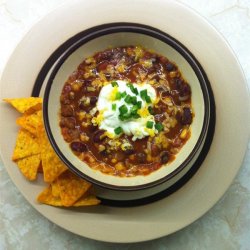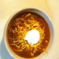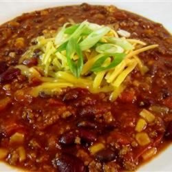 1In a large stock pot brown ground beef. Drain grease and add tomato vegetable juice, tomatoes, kidney beans, black beans, corn and taco seasoning. Heat through and serve.