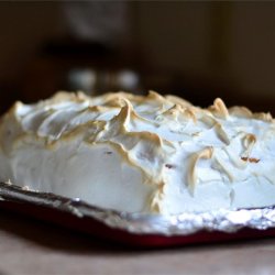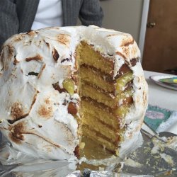6Beat the egg whites in a bowl until they form stiff peaks, then gradually add the sugar and continue to beat until the mixture forms a fluffy, shiny meringue. Spread the meringue all over the cake like a frosting, spreading it into decorative peaks and swirls. Place the decorated cake back into the hot oven, and bake until the peaks and swirls of meringue are lightly browned, about 10 minutes. Refrigerate 4 hours to overnight, then serve cold.