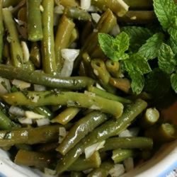 2Transfer green beans to a medium bowl, and mix with garlic, onion, and mint.