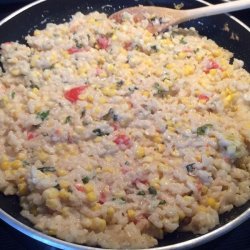 3Begin to add the heated milk-water mixture 1/2 cup at a time, stirring frequently. Wait until each addition is almost completely absorbed before adding the next. When the rice has cooked for 15 minutes and most of the liquid has been incorporated, add the corn kernels and tomatoes along with the end of the milk-water mixture. Cook, stirring frequently, until the rice is tender but still slightly chewy.