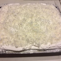 2Mix cream of coconut and sweetened condensed milk together. Pour over the top of the still hot cake. Let cake cool completely then frost with the whipped topping and top with the flaked coconut. Keep cake refrigerated.