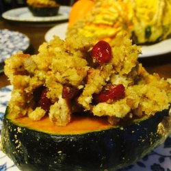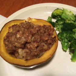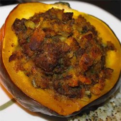 2Place squash, face up, in a shallow baking dish. In each half place 2 tablespoons butter, 2 tablespoons brown sugar, 1 cup stuffing mix, 3/4 cup chicken broth, salt, pepper, garlic powder and onion powder. Wrap each half tightly with aluminum foil.
