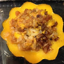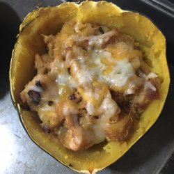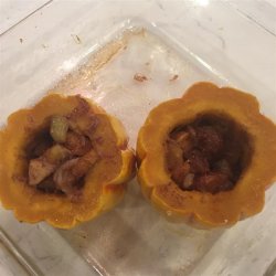 4Once the squash is done, stir the raisins, brown sugar, cinnamon, and Cheddar cheese into the apple mixture. Turn the squash cut side up on the baking sheet and fill with the apple mixture. Return the squash to the oven; bake until the filling is hot and the cheese has melted, about 15 minutes.
