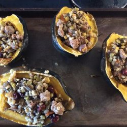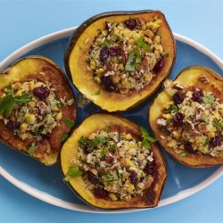 4Lightly mix the cooked rice mixture with the stuffing in a bowl, and pile the mixture into the centers of the squash without packing it. Return the stuffed squash to the oven and bake until the squash are tender and the stuffing is hot, about 15 more minutes.