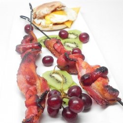 3Bake in the preheated oven for 15 minutes. Combine barbeque sauce and grape jelly in a microwave-safe bowl; heat in microwave for 30 seconds. Stir sauce and brush over skewers. Continue baking skewers, basting every 10 minutes, until bacon is desired crispness, 15 to 30 minutes more.
