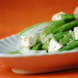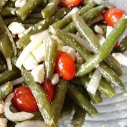 1Thinly slice the onion and place into a colander over the sink. Add the cleaned green beans to a large pot of boiling water and boil until crisp tender (about 4 minutes). When the beans are done, drain the water into the colander to slightly cook the onions. Immediately rinse all in cold water to stop the cooking process.