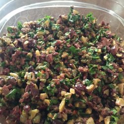 1Place the garlic cloves into a blender or food processor; pulse to mince. Add the olives, capers, parsley, lemon juice, and olive oil Blend until everything is finely chopped. Season to taste with salt and pepper.
