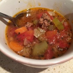 1Heat the olive oil in a large pot over medium heat. Stir in the garlic and onion; cook and stir until the onion has softened and turned translucent, about 5 minutes. Stir in the beef broth, then add the ground beef. Cook for 10 minutes, stirring and breaking up the ground beef. Mix in the diced tomatoes and tomato juice.