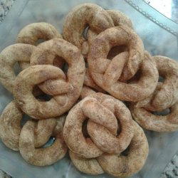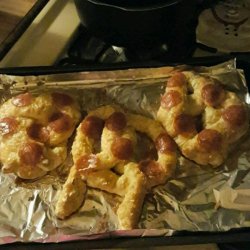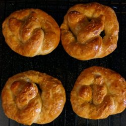 3After dough has risen, cut into 12 pieces. Roll each piece into a 3 foot rope, pencil thin or thinner. Twist into a pretzel shape, and dip into the baking soda solution. Place onto parchment covered baking sheets, and let rise 15 to 20 minutes.