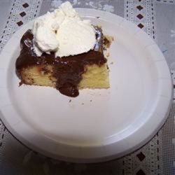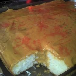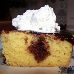 1Prepare and bake cake mix according to package directions for one 9x13 inch cake. Remove cake from oven. Poke holes at once down through cake to pan with the round handle of a wooden spoon. Holes should be at 1 inch intervals.