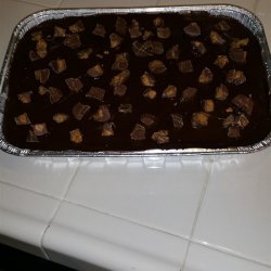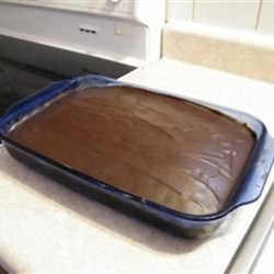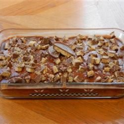 3Pour the warm chocolate peanut butter mixture over the cake, smoothing the surface and gently pressing it into the poked holes. Refrigerate for 3 hours before serving.