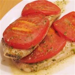 3Arrange the fillets in the bottom of the prepared baking dish; top each with tomato. Drizzle remaining marinade over the fillets. Cover with aluminum foil.