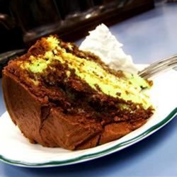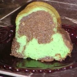 "This easy pistachio Bundt cake is baked with a layer of chocolate batter over a pistachio batter. Swirl it in for a marbled effect."