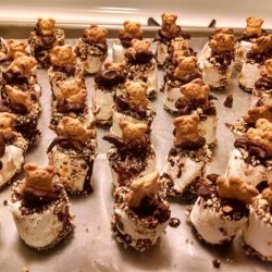 7Whisk the cooled ganache until fluffy; pipe into each marshmallow using a pastry bag or plastic bag with a corner cut off. Garnish each "hot tub" with a teddy bear-shaped graham snack.