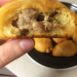 3Unroll crescent dough and separate into individual pieces; spoon 2 to 3 teaspoons sausage mixture onto each piece of dough. Roll dough around filling. Brush each crescent roll with egg white. Arrange crescent rolls on a baking sheet.