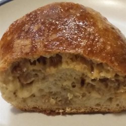 4Rough dough into a 10x14-inch rectangle on a baking sheet. Spread sausage-cheese mixture onto dough, leaving a 1-inch border. Roll dough around filling, starting from the long edge, creating a long log. Form the log into a circle and pinch edges together to seal. Brush top of roll with egg yolk.