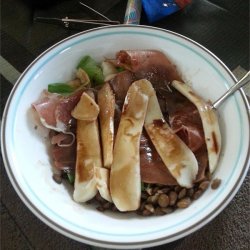 2Divide lentils among 4 salad plates; layer with mozzarella cheese slices, prosciutto, and fresh basil. Drizzle balsamic vinaigrette over each salad.