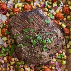7Cover loosely with foil and let rest 10 minutes before slicing steak thinly across the grain. Serve warm steak and vegetables with pan juices over romaine, sprinkled with feta cheese and parsley.