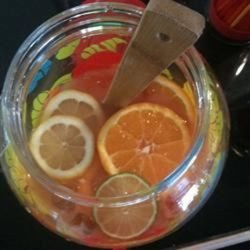 1In a large punch bowl, prepare the orange and pineapple juice according to package directions. Stir in the rum, banana liqueur and Grenadine. Float slices of orange, lime and lemon on top.