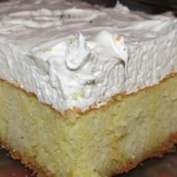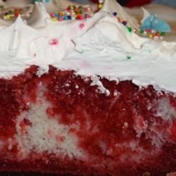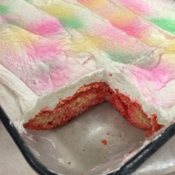 3Dip one cake pan in warm water for 10 seconds, then unmold onto a serving plate. Top with about 1 cup of the whipped topping. Dip the other cake pan in warm water for 10 seconds and unmold second cake layer, placing carefully on top of the first cake layer. Frost top and sides with the remaining whipped topping. Chill.