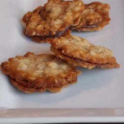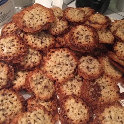 2In a large skillet over medium heat, melt the butter. Stir together the oats, flour, salt and sugar; mix into the melted butter until well blended. Stir in the corn syrup, milk and vanilla. Drop batter by teaspoonfuls 3 inches apart onto the prepared cookie sheets.