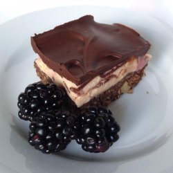 3Melt chocolate and 2 tablespoons of butter in a saucepan over very low heat, stirring until the chocolate is completely melted and smooth. Remove from heat, and pour over the filling layer, spreading the topping over the filling to cover completely. Return to refrigerator, and allow to set until firm, at least 30 minutes. To cut, dip a very sharp knife into boiling water, and cut into squares with the hot knife.