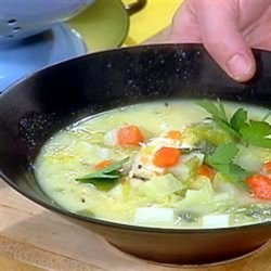 4Beat the cream and the egg yolks with 2 tablespoons of the hot liquid; stir into pot. Heat through, but do not allow to boil as the cream will curdle. Sprinkle in the parsley before serving.