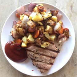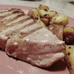 "Tuna is available most of the year, so fresh steaks should be easy to come by. Be choosy: a reddish color is acceptable, but flesh with dark spots or streaks should be avoided. As with all great ocean fish, the flesh tends to be dry. Marinate with oil, and avoid overcooking. The timing is critical, as tuna should be served medium rare. Use a kitchen timer."
