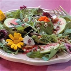 "This easy salad recipe will thrill all of your guests! A bowl of mixed greens is adorned with bits of apple, chopped walnuts, and Gorgonzola or feta cheese, and tossed with a prepared raspberry vinaigrette."
