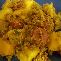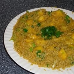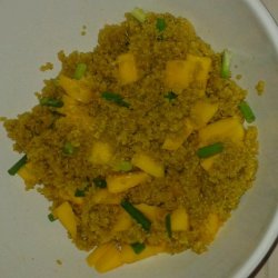 1Bring chicken stock, quinoa, curry powder, garlic powder, salt, and pepper to a boil in a saucepan over high heat. Reduce heat to medium-low, cover, and simmer until the quinoa is tender, 15 to 20 minutes. Once done, scrape the quinoa into a shallow dish and allow to cool to room temperature. Stir in the mango and green onions. Serve either at room temperature or cold.