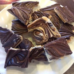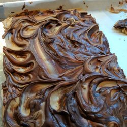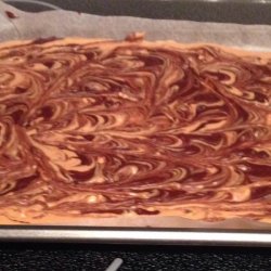 4Spread peanut butter mixture onto the prepared baking sheet. Evenly distribute melted semi-sweet chocolate over peanut butter mixture. Using the tip of a sharp knife, drag semi-sweet chocolate through peanut butter mixture making a marble-pattern.