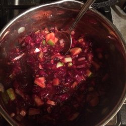 "This piquant chutney is not as sweet as traditional cranberry sauce. The bite of the fresh ginger will become more pronounced as the chutney rests. If you have any left after Thanksgiving, try it in turkey sandwiches with a smear of cream cheese. Oh. My. God."