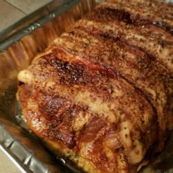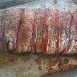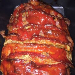 5Wrap partially-cooked bacon slices around the meatloaf, tucking the ends of bacon underneath the loaf.