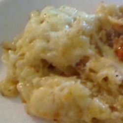3Place potato mixture into the prepared baking dish and pour milk over top. Bake in the preheated oven for 40 minutes. Sprinkle top with cheese, return to oven and bake until cheese melts and is slightly browned.