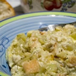 "Eggplant casserole baked with Cheddar cheese, cream and bread crumbs."
