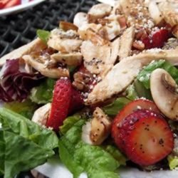 In a salad bowl, combine the mushrooms and mixed greens; add dressing and toss. Sprinkle with strawberries and pecans.