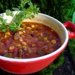 "This is a hearty and relatively low-fat chili recipe that is guaranteed to satisfy even the most sadistic spicy food lover...REAL MAN FOOD. (For those with wimpier taste buds, omit the Habanero pepper). Try melting a tablespoon of whipped cream cheese into each dish. Hoo boy! Also, drink beer with lime. The acidity seems to help calm the assault on your taste buds when it gets to be too much."