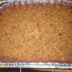 3In a large pot, saute sausage in margarine with the onion, garlic, green bell pepper and celery until tender. Stir parsley, poultry seasoning, sage and salt into the mixture. Pour broth, eggs and cornbread/breadcrumbs into the mixture; mix until the ingredients stick together easily. Transfer to a 9x13 inch pan.