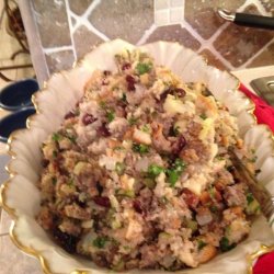 4Melt 2 tablespoons of butter in the same skillet over medium heat. Stir in the onion and celery, and cook until the onion has softened and turned translucent, about 5 minutes. Season to taste with sea salt and pepper, and scrape into the bowl with the bread cubes. Stir in the apples, cranberries, walnuts, sage, rosemary, thyme, and parsley. Whisk the eggs in a bowl along with the chicken stock, and pour over the bread mixture along with 1/2 cup of melted butter. Stir well until the bread cubes have absorbed the chicken stock. Pack into the prepared 9x13 inch baking dish and cover with aluminum foil.