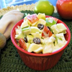"This creamy Waldorf Salad boasts the addition of golden raisins, fluffy whipped cream and tangy lemon and orange juices to the usual apples, celery and mayonnaise."
