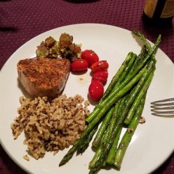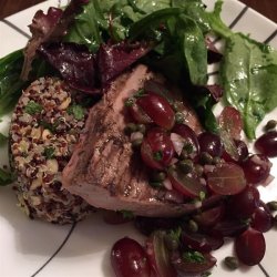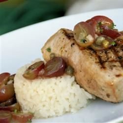 3Cook tuna steaks on preheated grill until cooked to desired degree of doneness, 2 to 3 minutes per side for medium-rare. Serve with the grape and caper salsa.