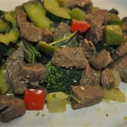 3While the meat is resting, return the skillet to medium heat and add the snow peas, broccoli, bok choy, bell pepper, bean sprouts and zucchini; cook and stir until the vegetables are softened. Pour the sauce into the pan and allow to simmer 5 minutes.