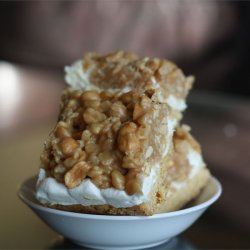 "A moist cakey vanilla base is coated with a layer of melted marshmallow, then topped off with a chewy butterscotch peanut layer to make an irresistible treat."