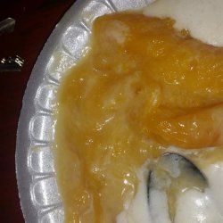 4Arrange mangoes on top of the batter and pour 2 cups reserved syrup over mangoes.