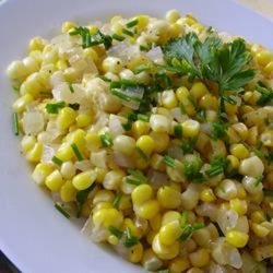 Heat the butter in a saucepan over medium heat, and stir in the corn and onion. Cook 5 minutes, until heated through. Mix in parsley, and season with salt and pepper. Garnish with chives to serve.