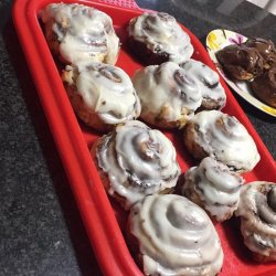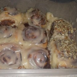 3Roll dough into a 16x21-inch rectangle. Spread dough with 1/3 cup butter and sprinkle evenly with sugar/cinnamon mixture. Roll up dough and cut into 12 rolls. Place rolls in a lightly greased 9x13 inch baking pan. Cover and let rise until nearly doubled, about 30 minutes. Meanwhile, preheat oven to 400 degrees F (200 degrees C).