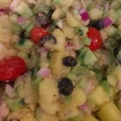 "This is one of my favorite recipes handed down from my mom. The best thing is there are lots of vegetables and flavors, and it's usually a welcome change from standard American versions. The olives are the best part! To save time, I usually chop all the vegetables and make the dressing while the potatoes are boiling."