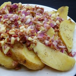 4Core apple and finely chop; add to reserved marinade. Stir in bacon (or ham), olives and onion. Spoon over potatoes and serve.